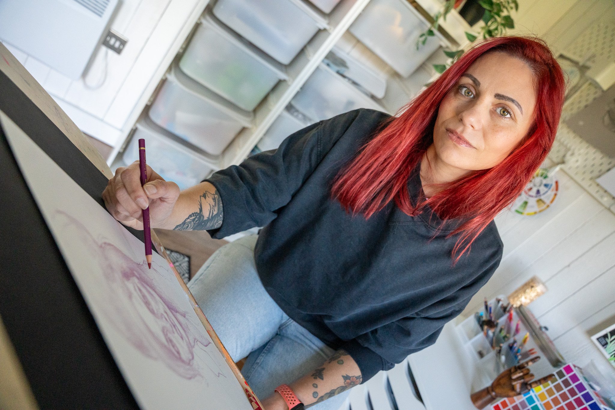 Whilst keen to never be entirely pigeonholed, she considers herself mainly a figurative & portrait artist. Her strong & unique style has really been emerging in the last year. Combining a variety of mediums alongside her consistent monochromatic pencil drawings to give depth, interest & contrast.